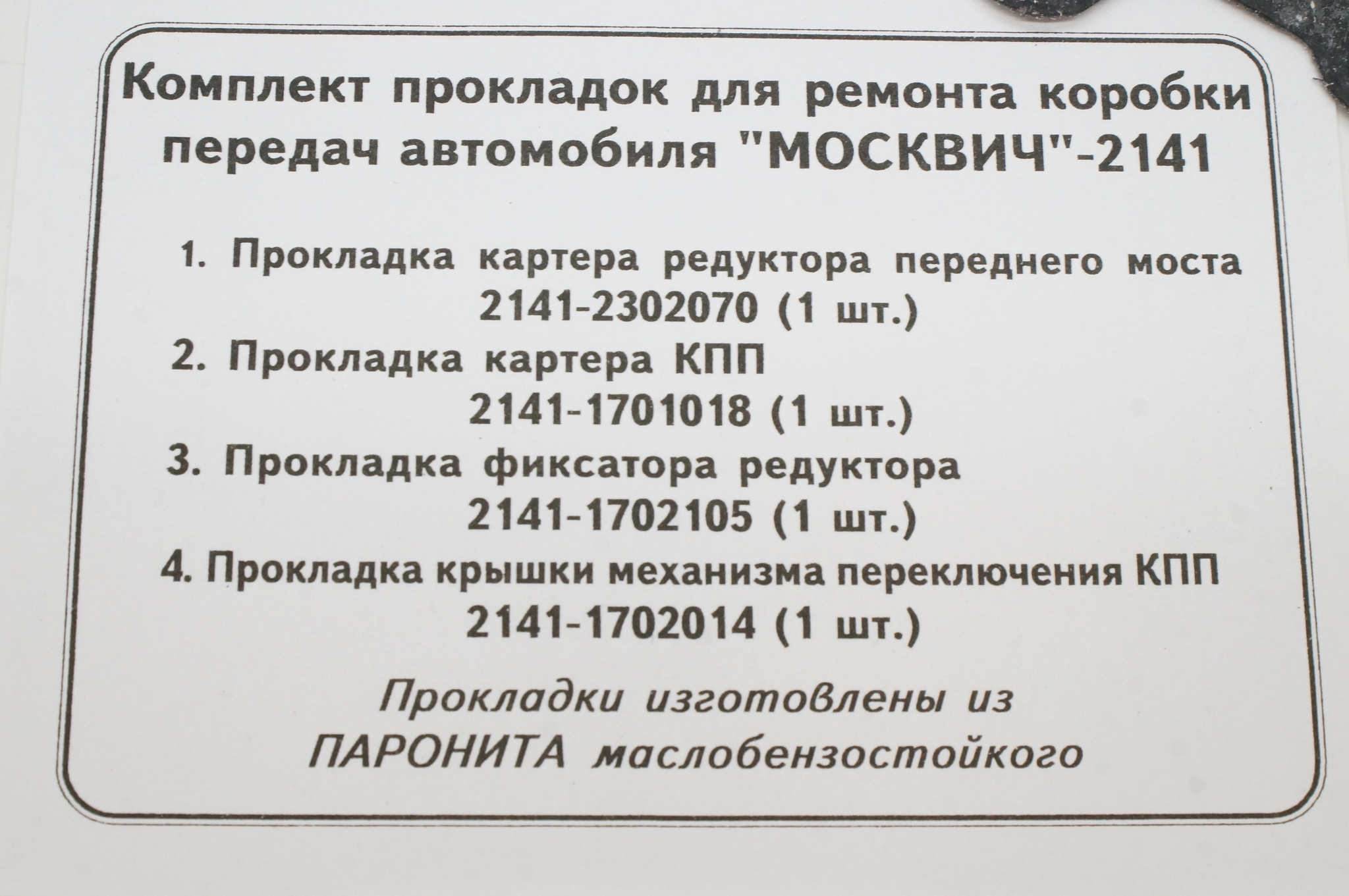 Комплект прокладок КПП Москвич 2141. Новый.