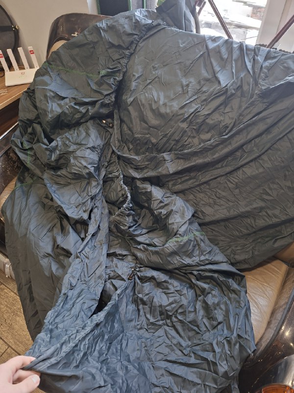 Тент-чехол из качественной синтетической ткани. На тенте спереди и сзади натягивающие резинки. По всему периметру низа идет шнур с фиксаторами на уровне передних и задних колес.